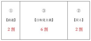①②は対抗する存在なので、左右に分けて、真ん中に③【日和見主義】を置いてみるとこんな感じです。