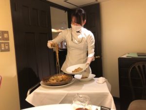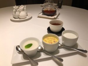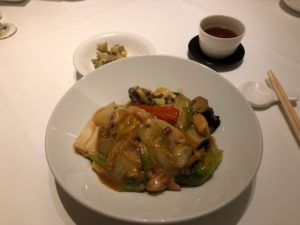 私は、蟹肉入りコーンスープ、海鮮入りXO醤陶板焼きそば、それにデザートでお腹いっぱいになりました。
