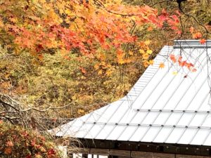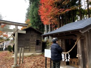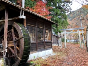 大沢温泉を出てすぐの土手には、古い水車と神社があり、紅葉がとても綺麗だったのでまずはお参りを。